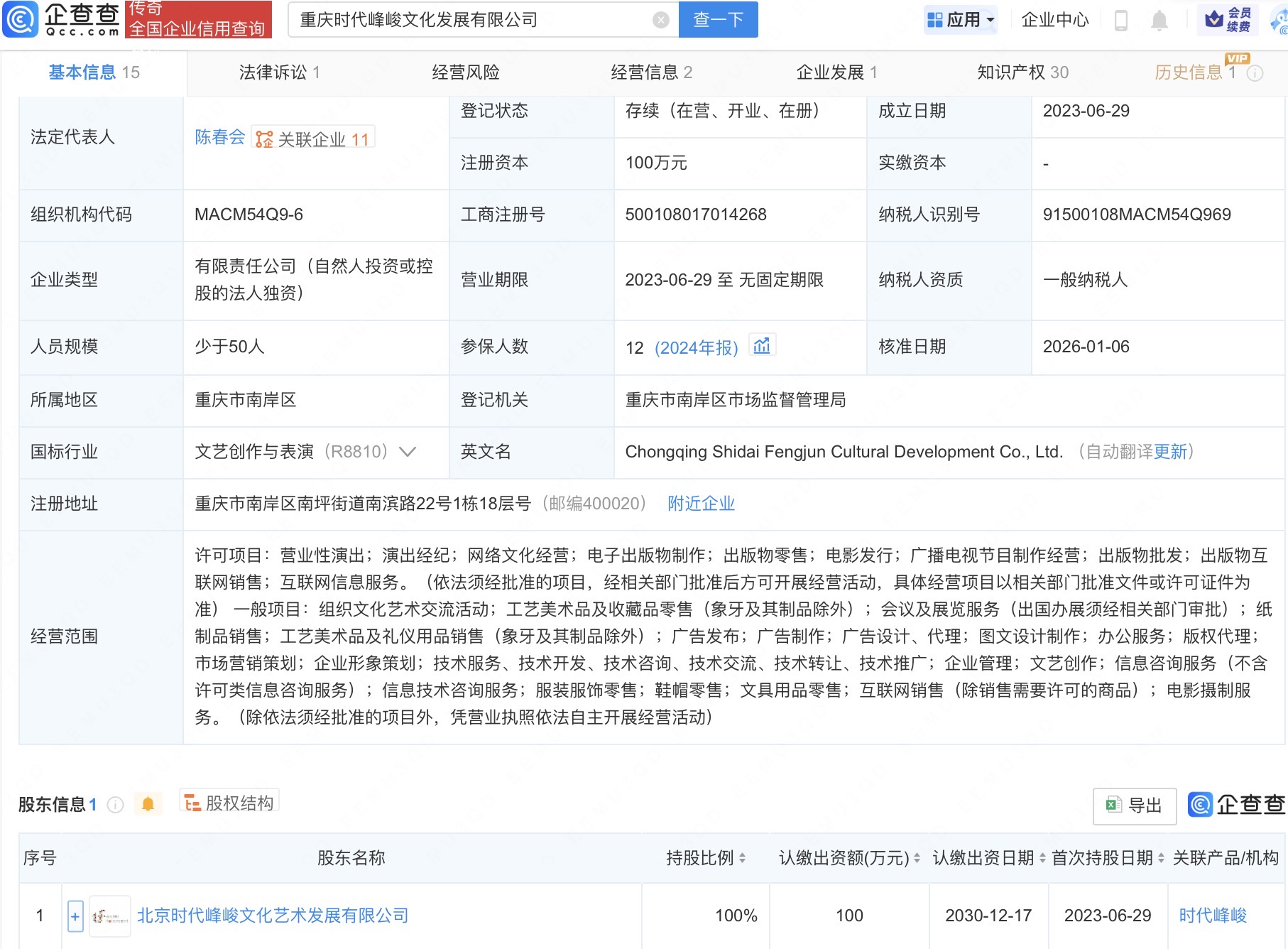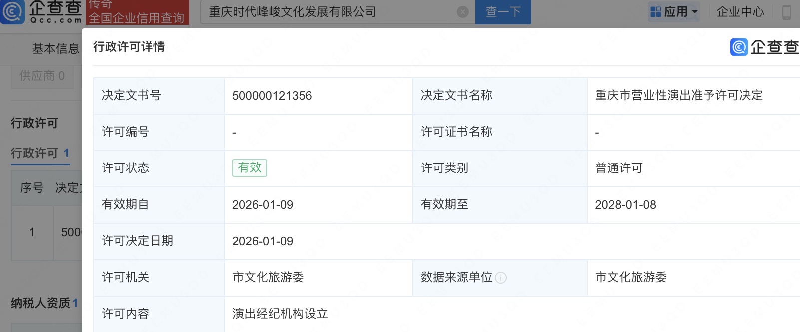 近日,重庆时代峰峻文化发展有限公司新增一则行政许可信息,许可证名称为重庆市营业性演出准予许可决定,许可内容为演出经纪机构设立,许可机关为市文化旅游委。该公司成立于2023年6月,经营范围含营业性演出、演出经纪、网络文化经营等,由北京时代峰峻文化艺术发展有限公司全资持股。